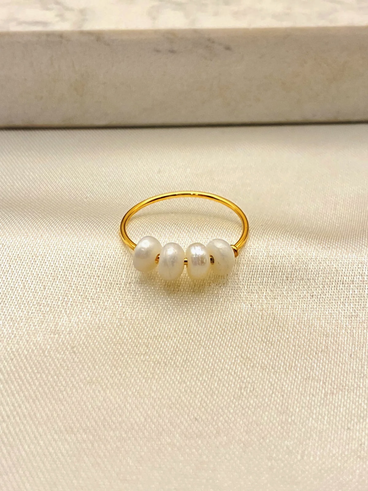 - Anillo dorado delicado con cinco perlas naturales blancas. Elegancia sutil y atemporal para un estilo refinado y femenino.