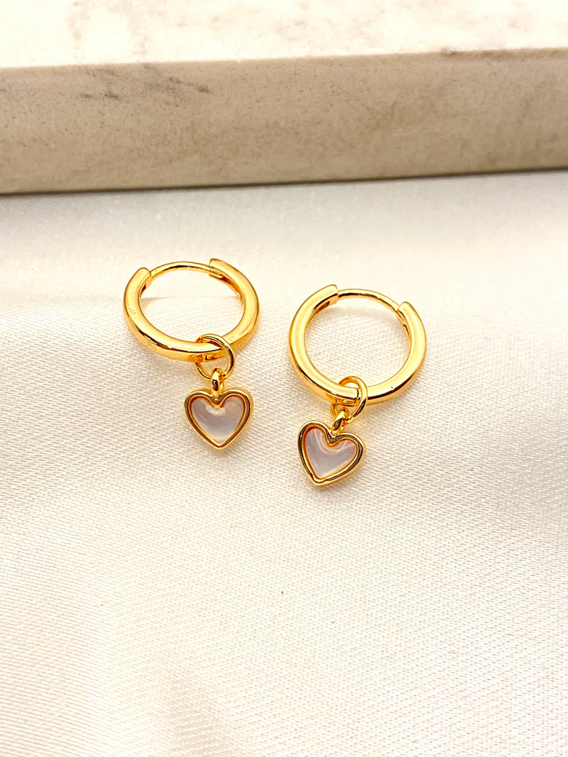 - Aros dorados minimalistas con pequeños dijes de corazón blanco nacarado, delicados, románticos y perfectos para uso diario.