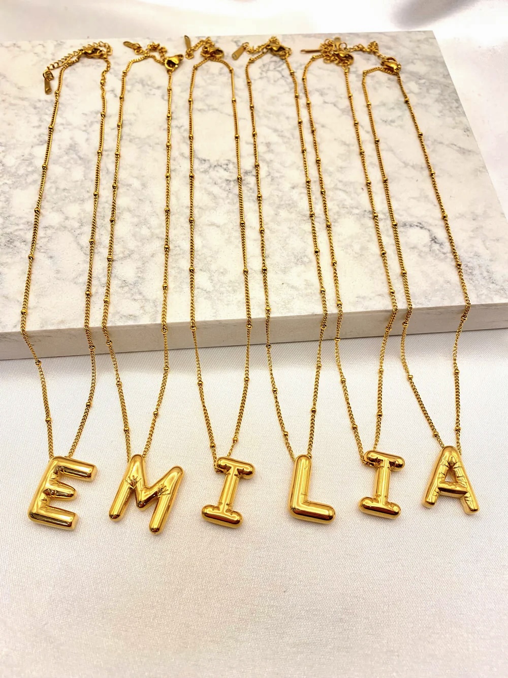 - Collares dorados con iniciales estilo globo, cadena delicada y letras voluminosas. Ideal para personalizar con tu nombre o inicial.